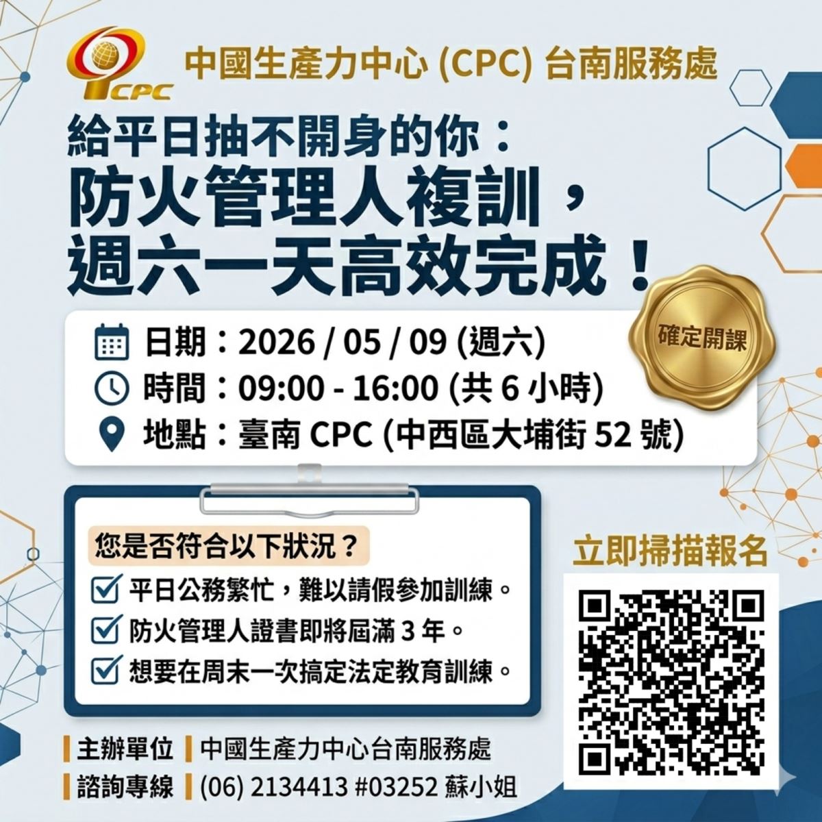 🔥假日限定!防火管理人複訓班開課啦 🔥 證照快到期卻一直沒時間? 平日請假太麻煩?這一班就是為你準備的! 假日上課,一天完成 6 小時複訓